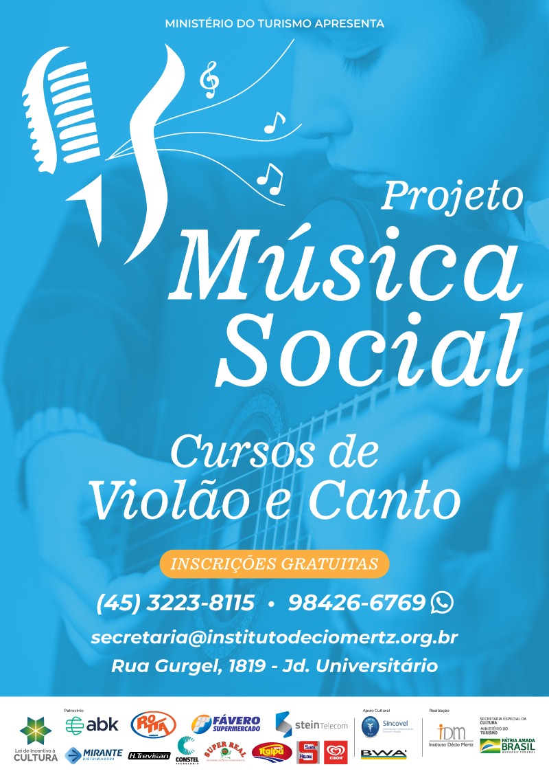 O Instituto Décio Mertz – IDM, www.instituodeciomertz.org.br, organização que atua na área de responsabilidade social para a classe dos profissionais da Contabilidade na região oeste do Paraná, com apoio do SINCOVEL -Sindicato dos Contabilistas de Cascavel, do Ministério do Turismo, Secretaria Especial da Cultura, Lei de Incentivo à Cultura e de empresas patrocinadoras vem realizando desde o ano de 2021 o projeto MÚSICA SOCIAL, que tem por objetivo ofertar aulas gratuitas de música para os cursos de violão e de canto para crianças e jovens da comunidade.