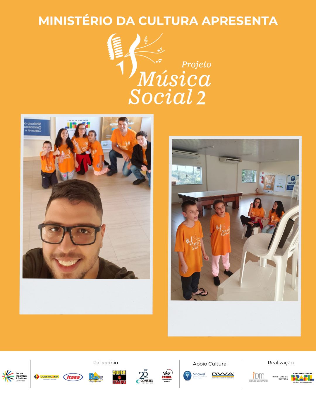O Projeto Música Social II é realizado por meio da Lei de Incentivo à Cultura, com patrocínio das empresas Constru e CIA, Itasa, RAK Supermercado, Constel e Rainha Supermercado, apoio cultural do Sincovel e da BWA, e realização do Instituto Décio Mertz, Ministério da Cultura e Governo Federal.
